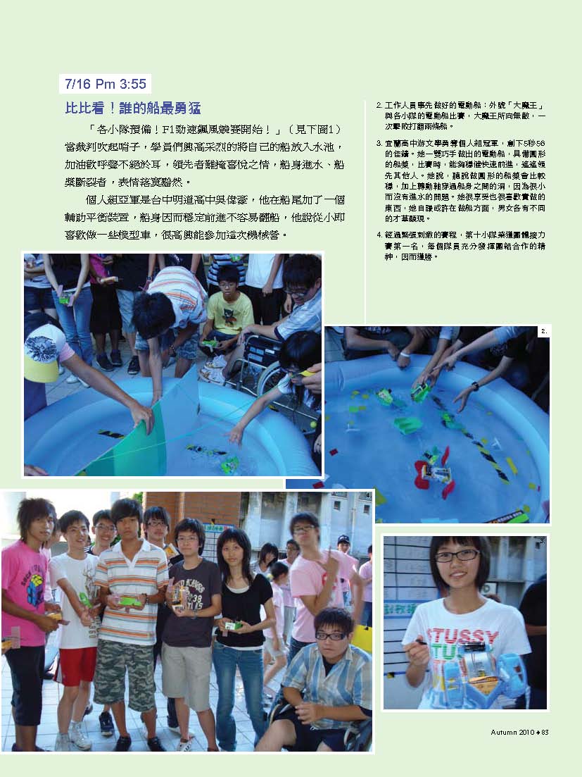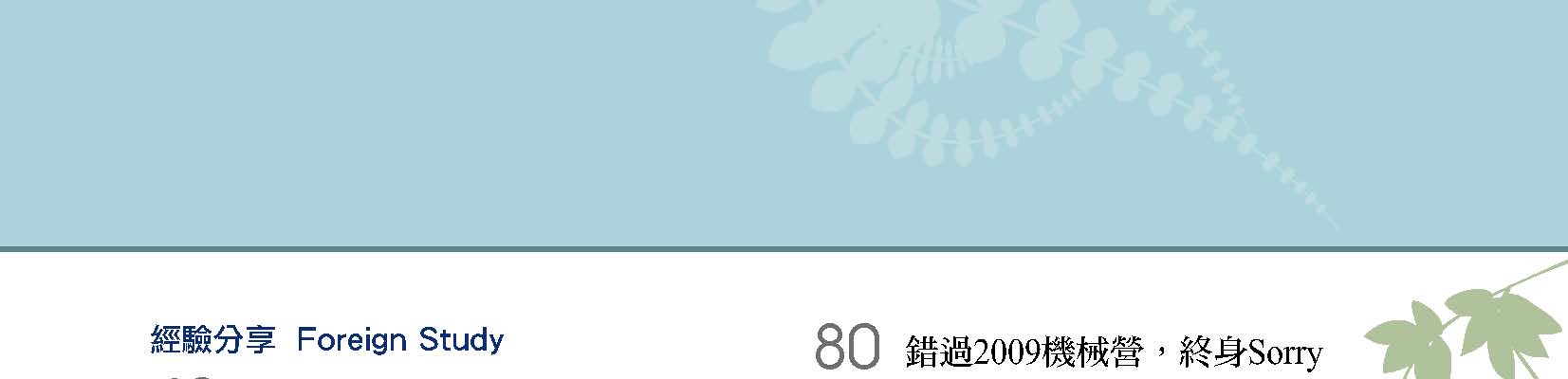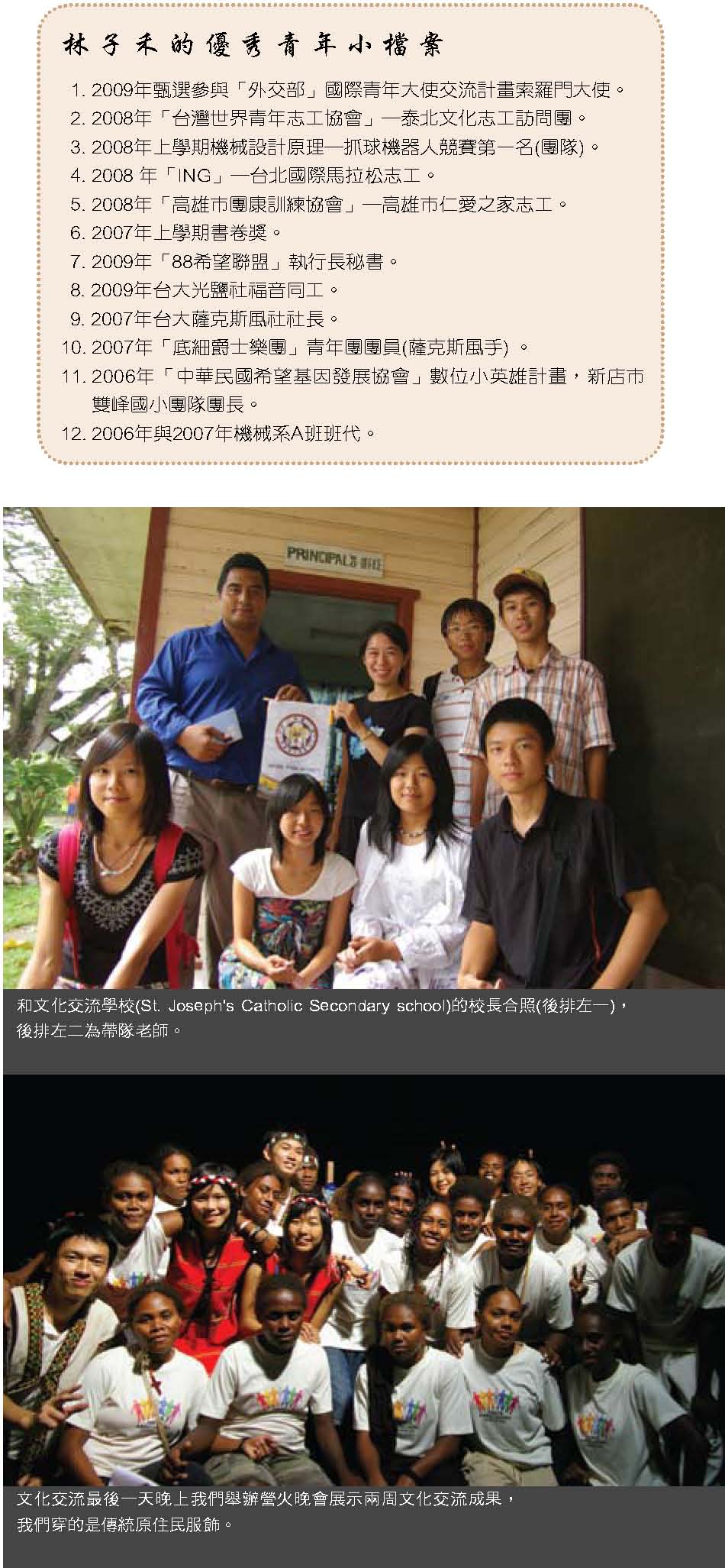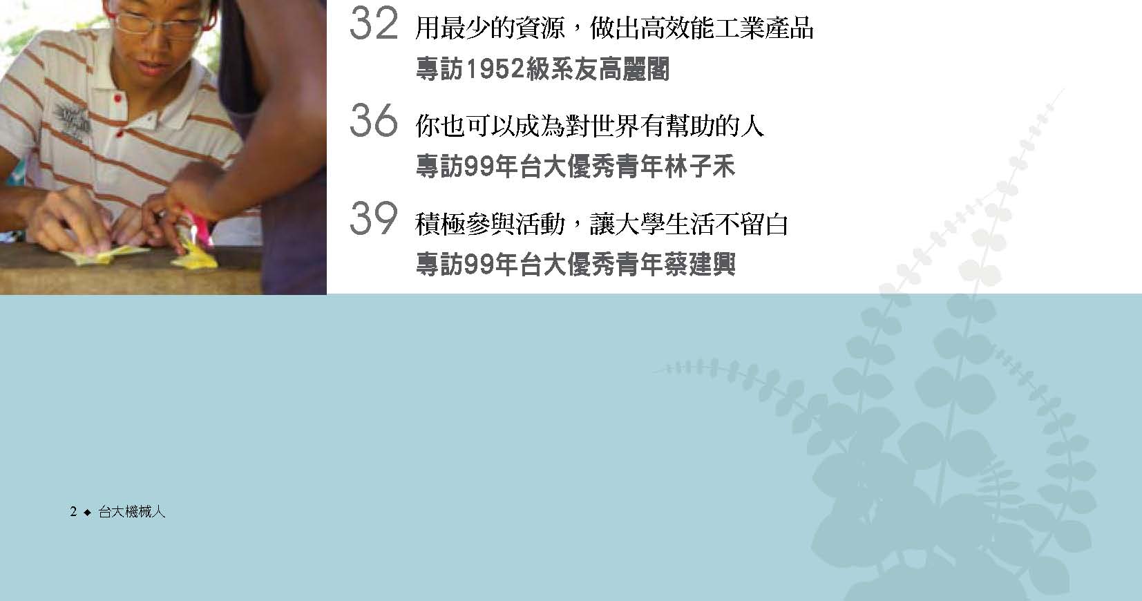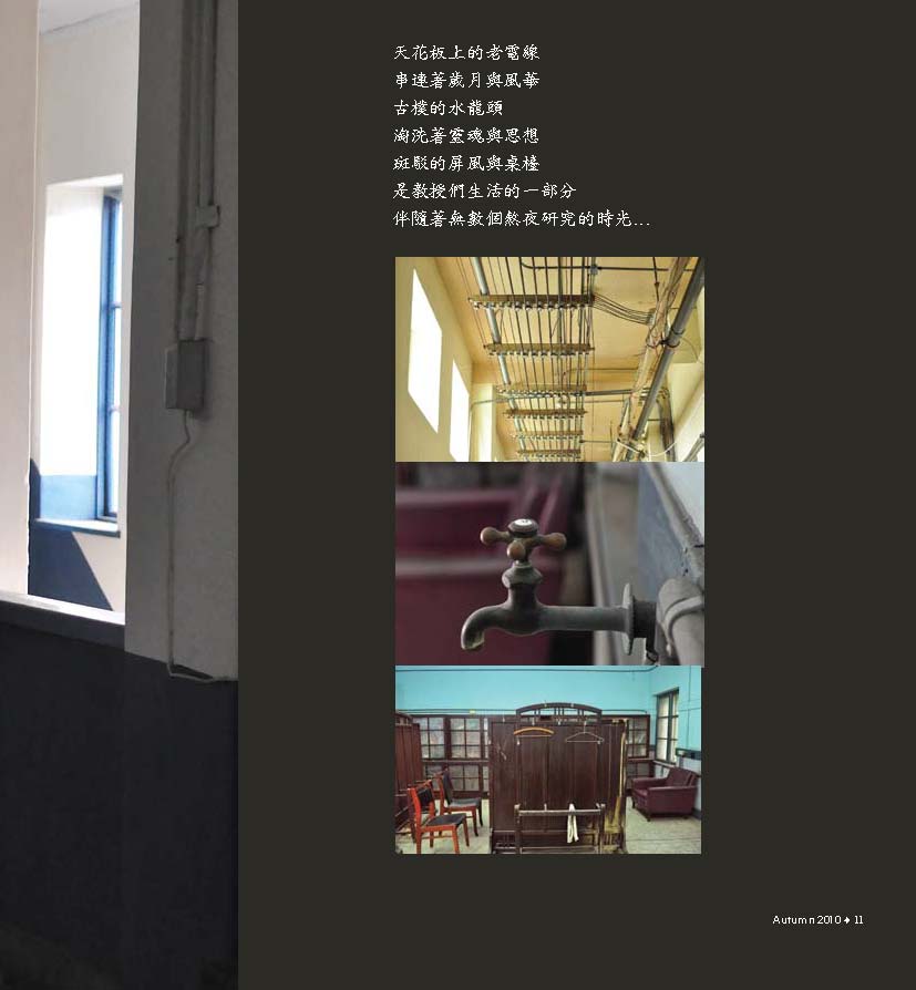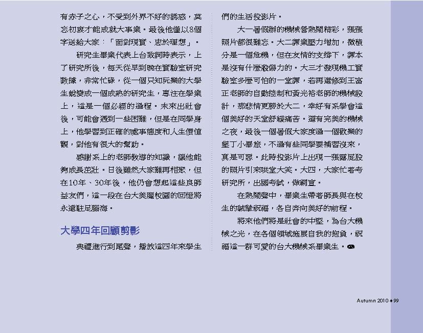 除了典藏系館專題以外,本期還有很多精彩的故事值得細細閱讀。兩位當選99年台大優秀青年的機械系學生:林子禾跟蔡建興,走出書本,以不同的方式服務人群,不僅讓自己的大學生涯多采多姿,也幫助更多人擁有不同的生命體驗!