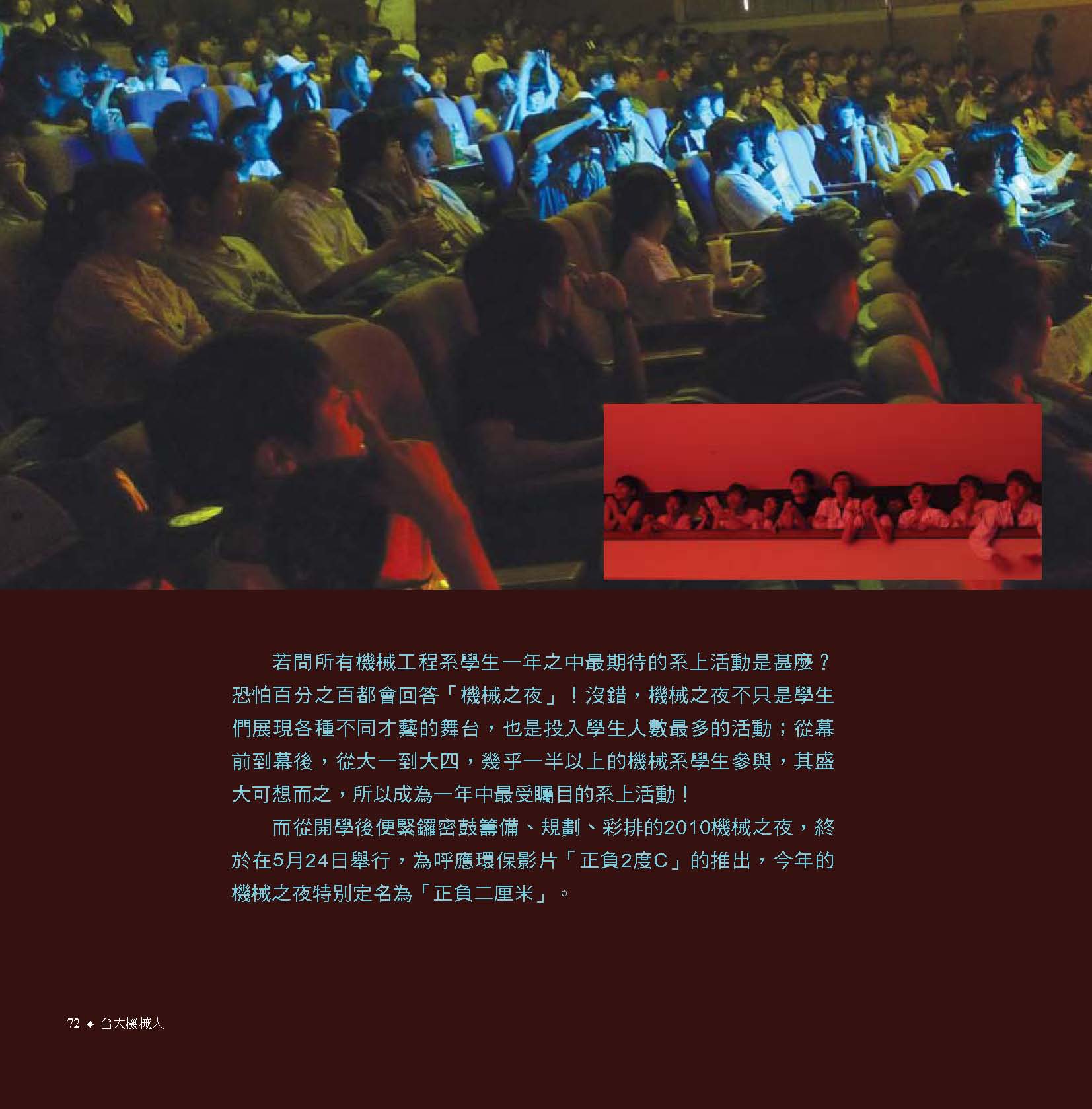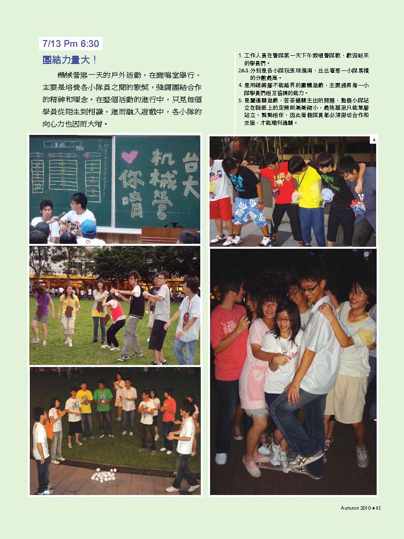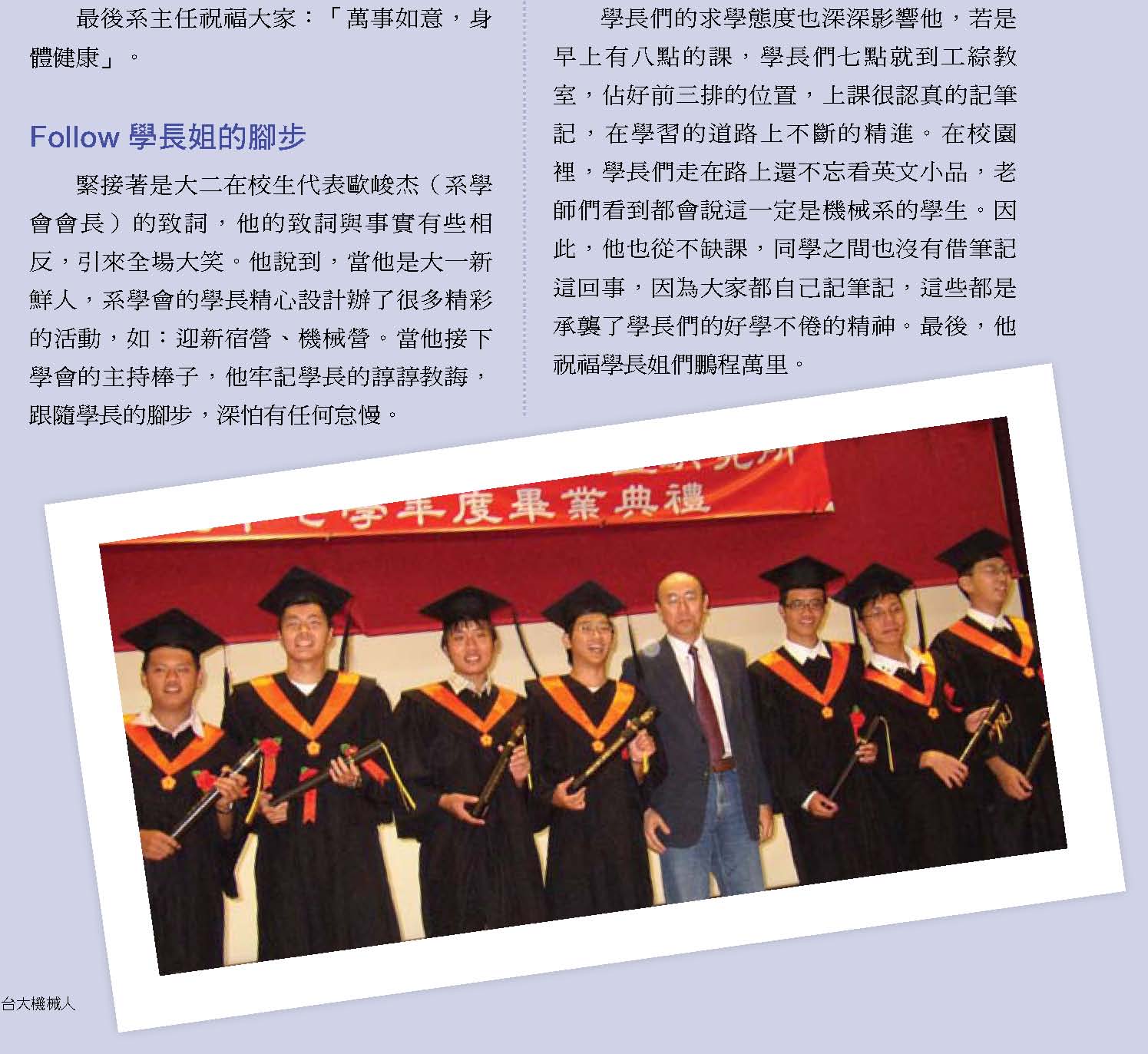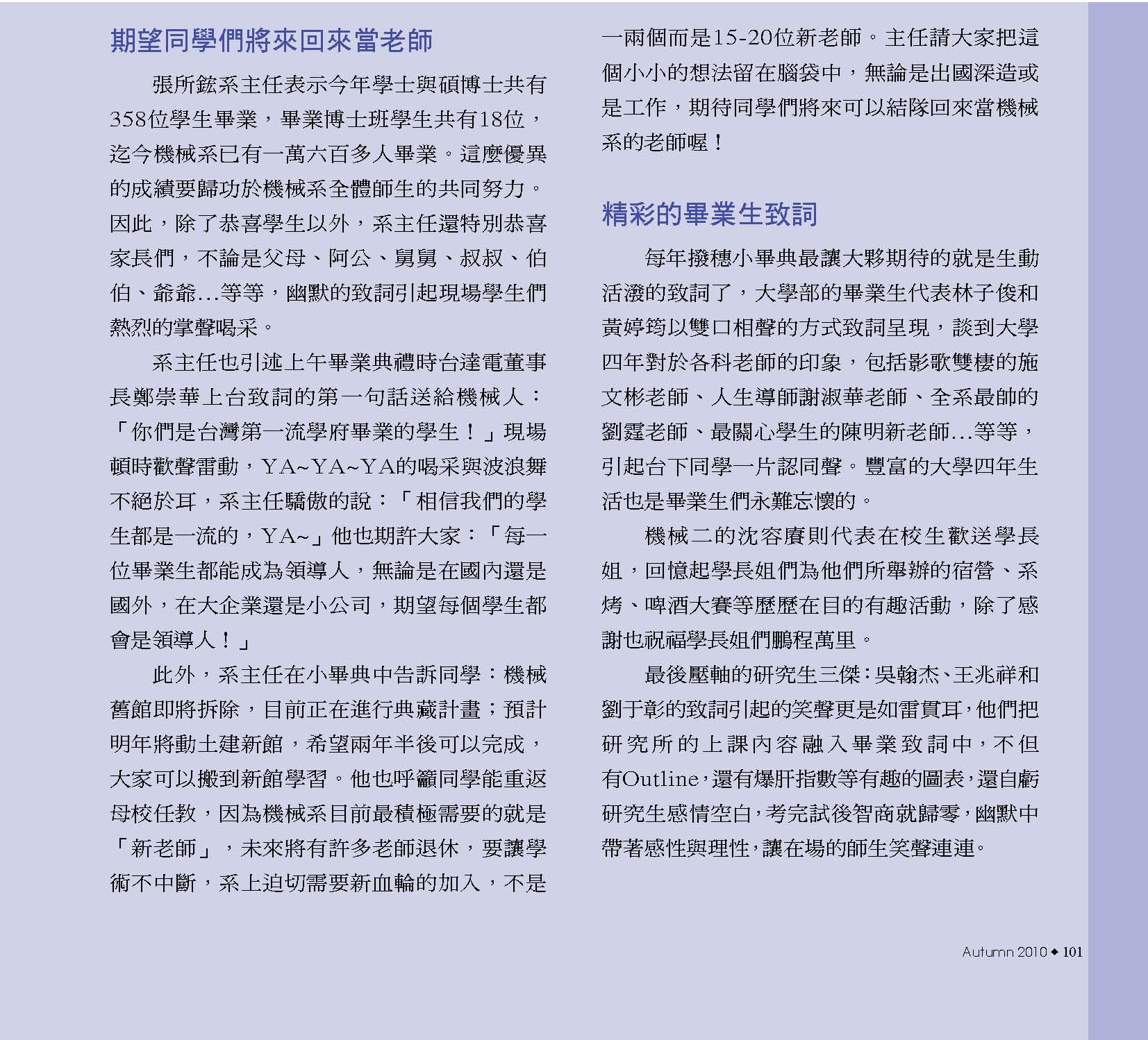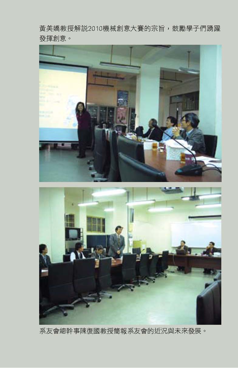 而振芬跟鈺雲也分別採訪了精彩的機械之夜、機械競賽、機械營跟尾牙大會師等活動,更讓人見識到台大機械系學生的絕倫創意;同學們不僅能歌善舞、也能把書本的理論應用到機械設計之中,想知道更多精彩實況嗎?快翻開這期的系刊吧!