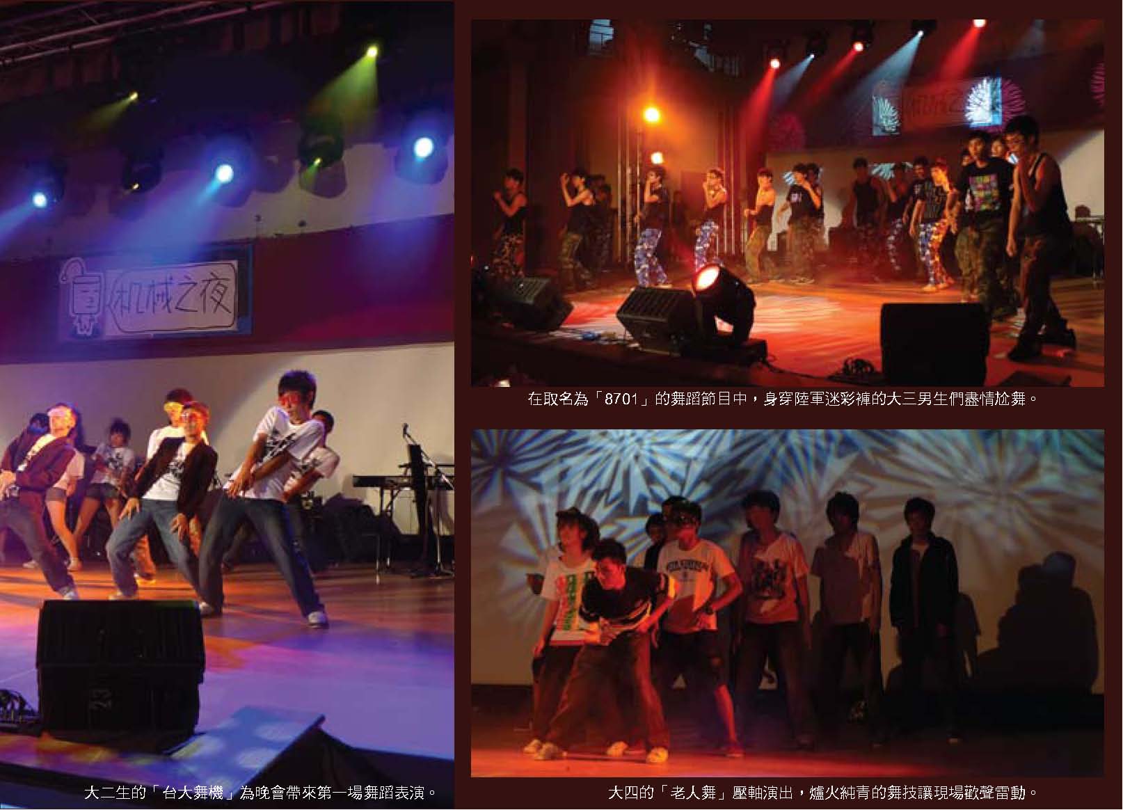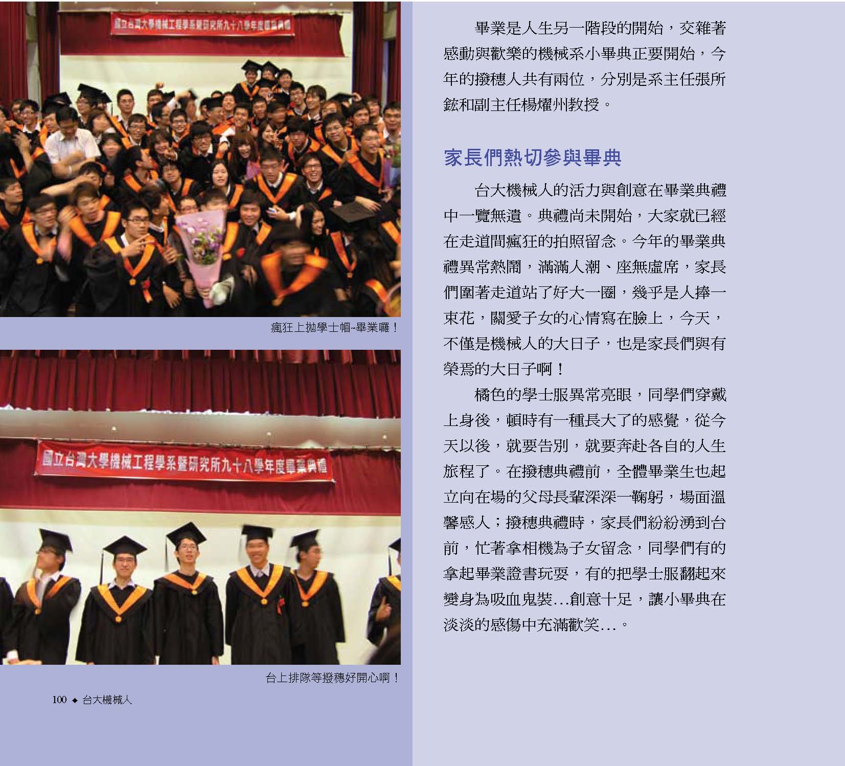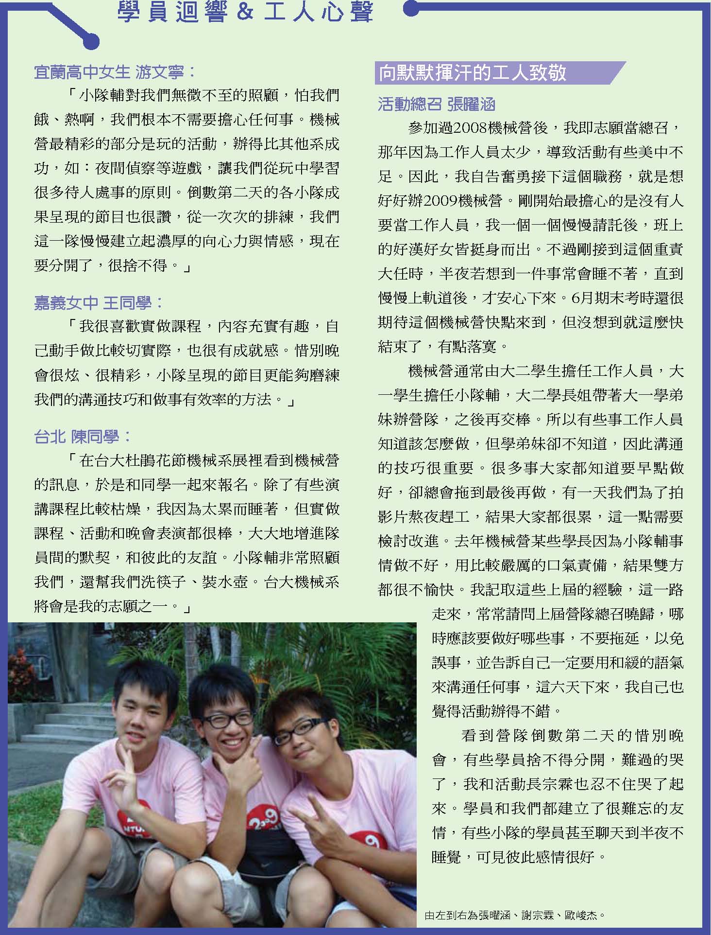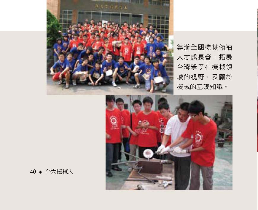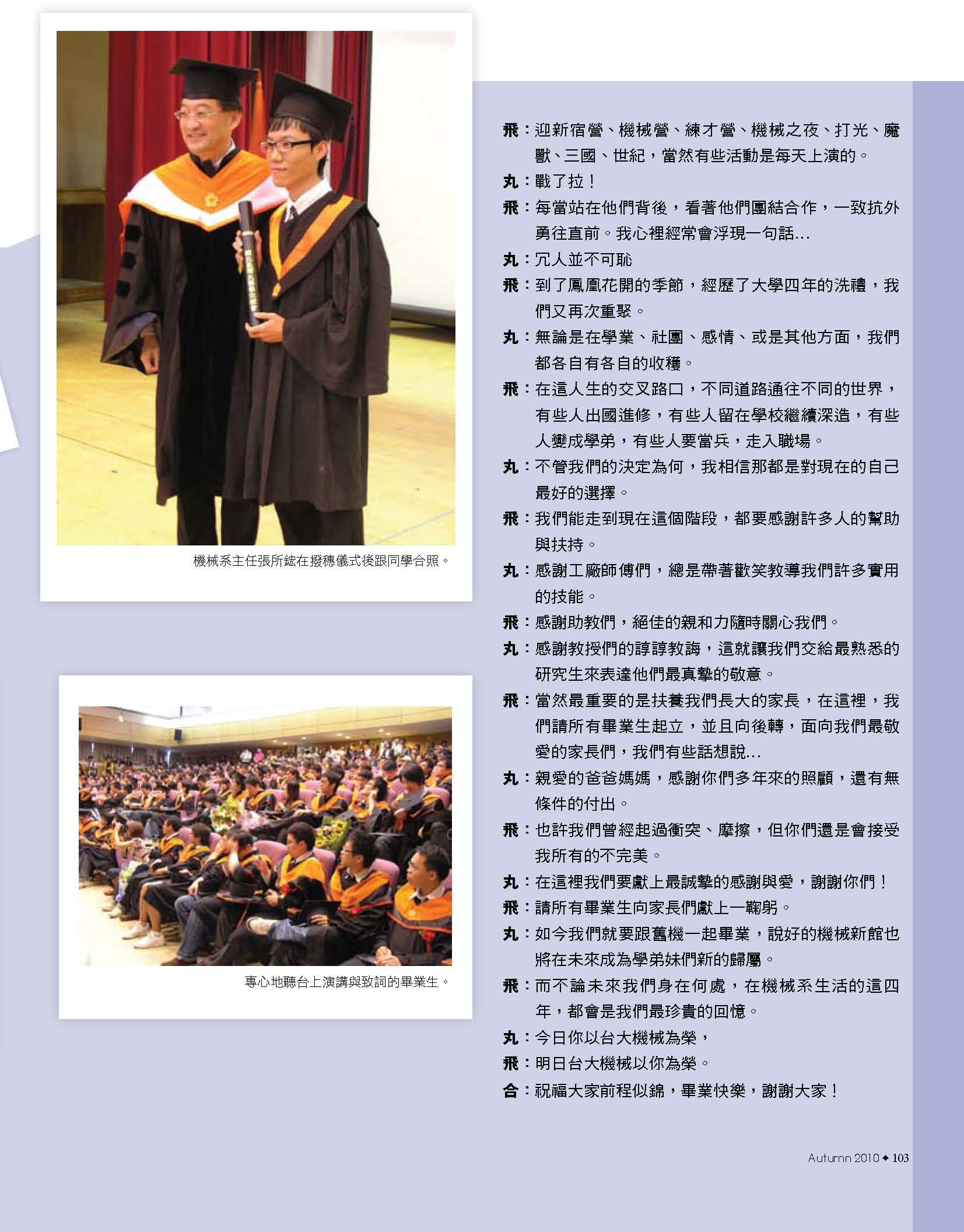 而振芬跟鈺雲也分別採訪了精彩的機械之夜、機械競賽、機械營跟尾牙大會師等活動,更讓人見識到台大機械系學生的絕倫創意;同學們不僅能歌善舞、也能把書本的理論應用到機械設計之中,想知道更多精彩實況嗎?快翻開這期的系刊吧!