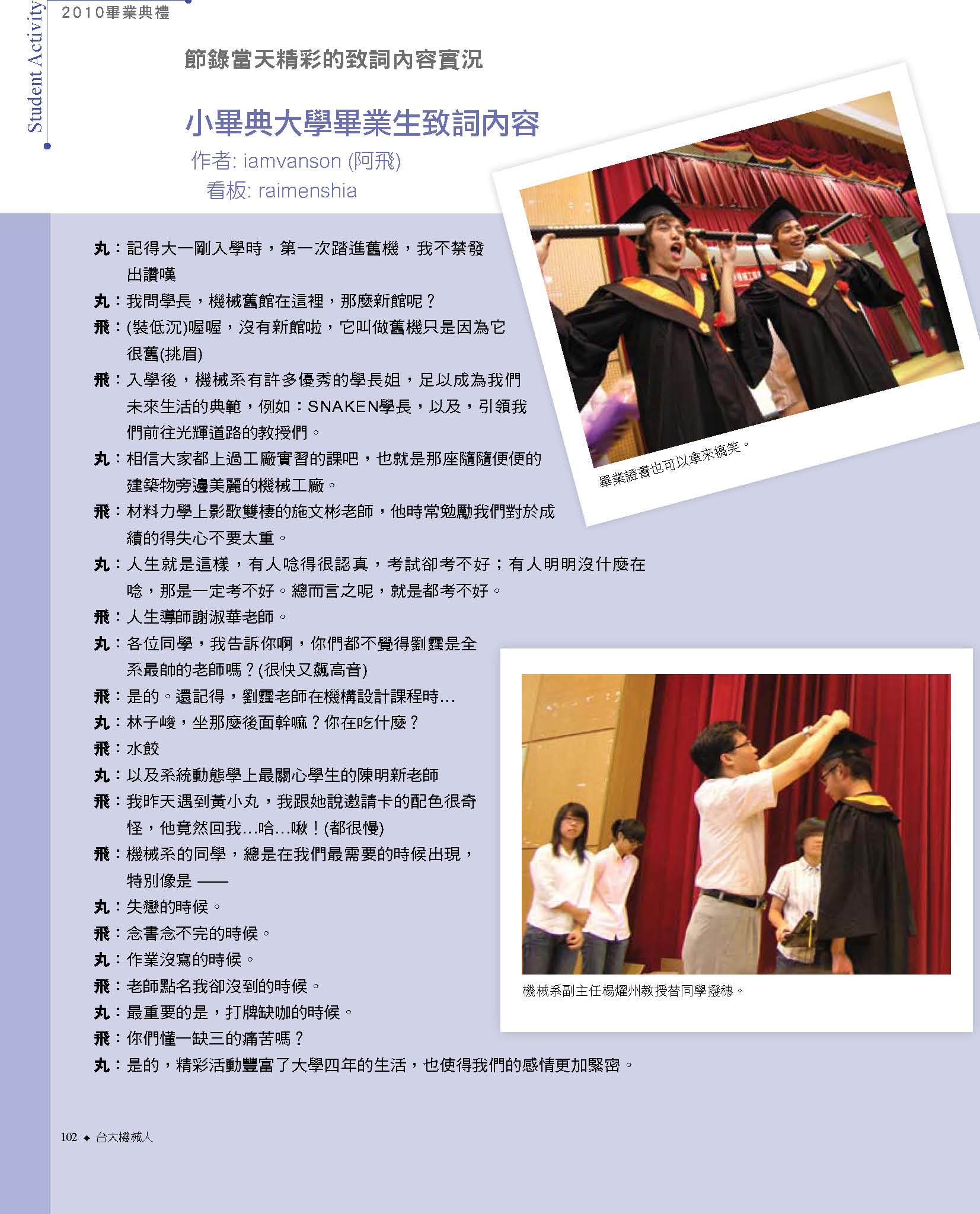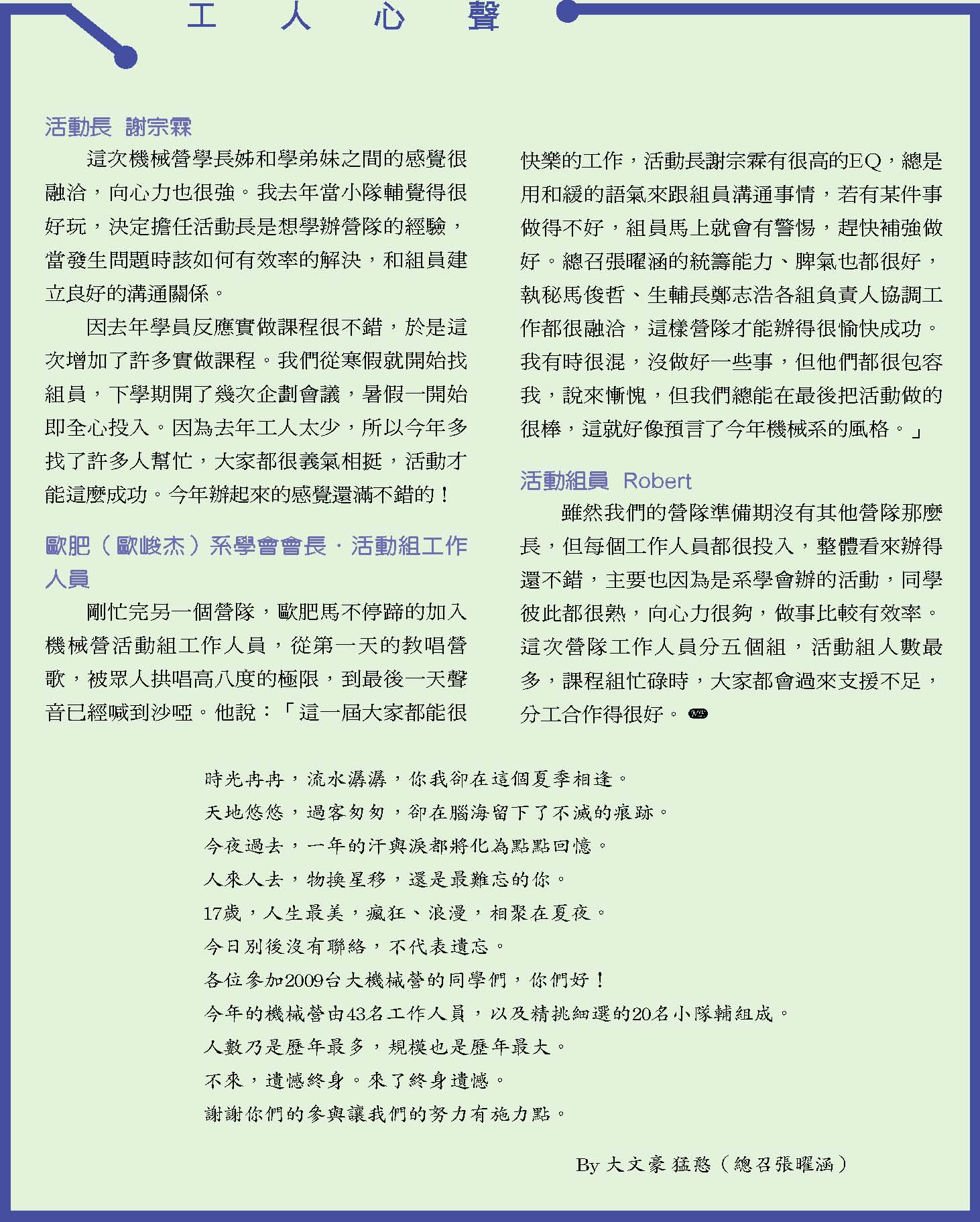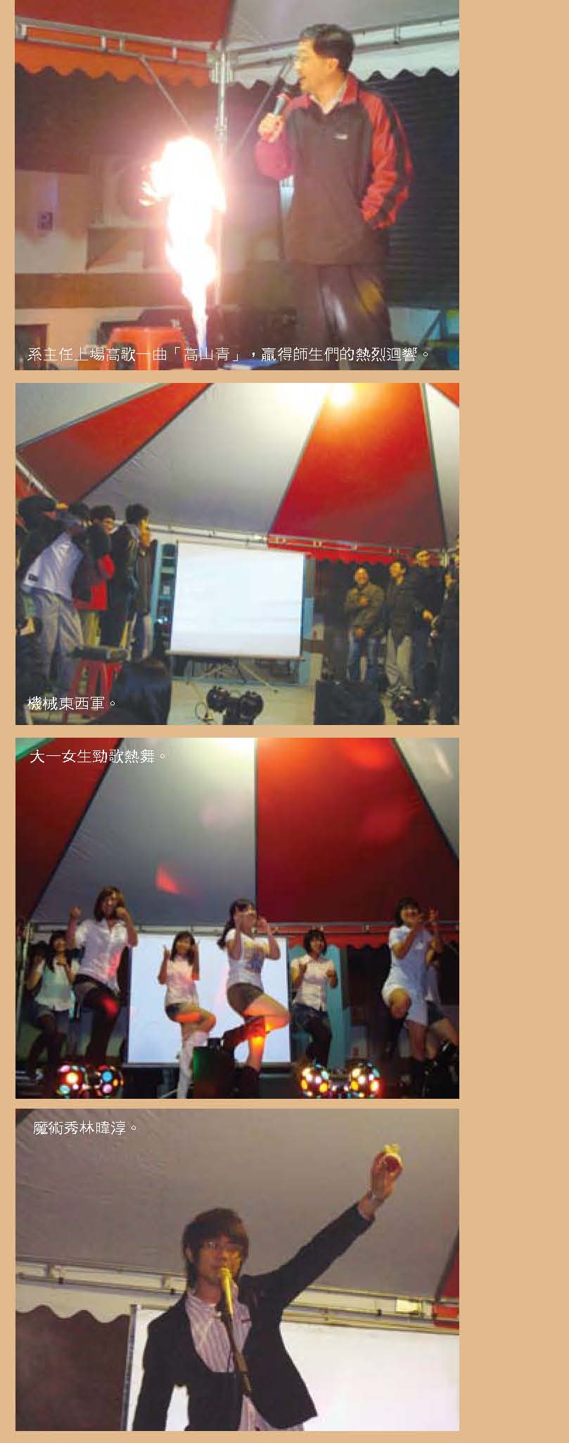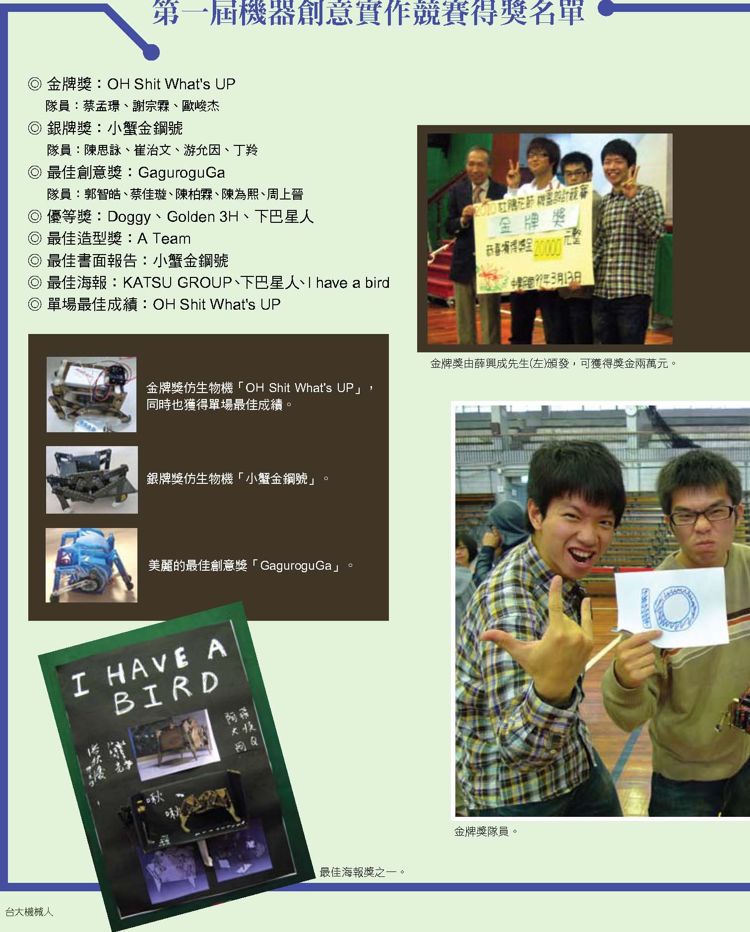 而振芬跟鈺雲也分別採訪了精彩的機械之夜、機械競賽、機械營跟尾牙大會師等活動,更讓人見識到台大機械系學生的絕倫創意;同學們不僅能歌善舞、也能把書本的理論應用到機械設計之中,想知道更多精彩實況嗎?快翻開這期的系刊吧!