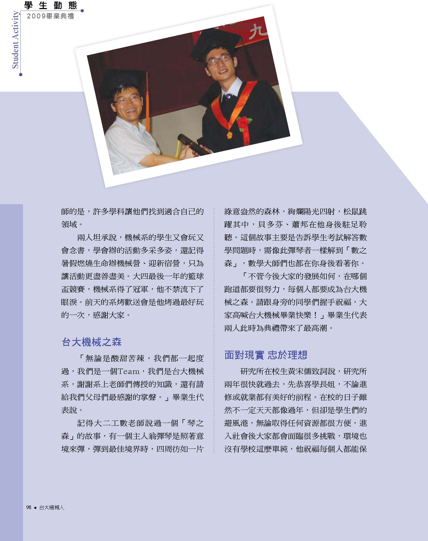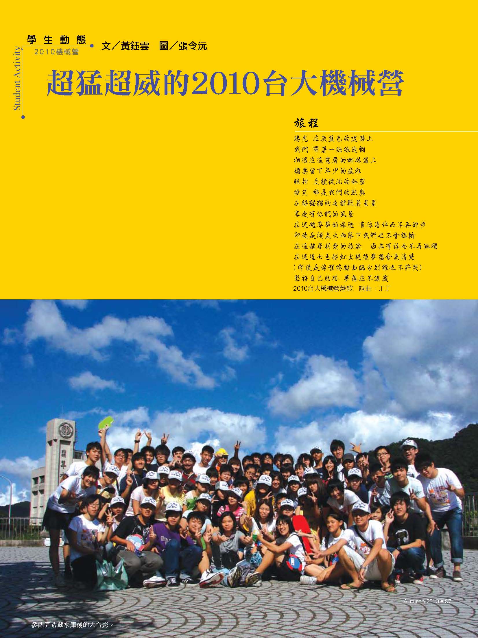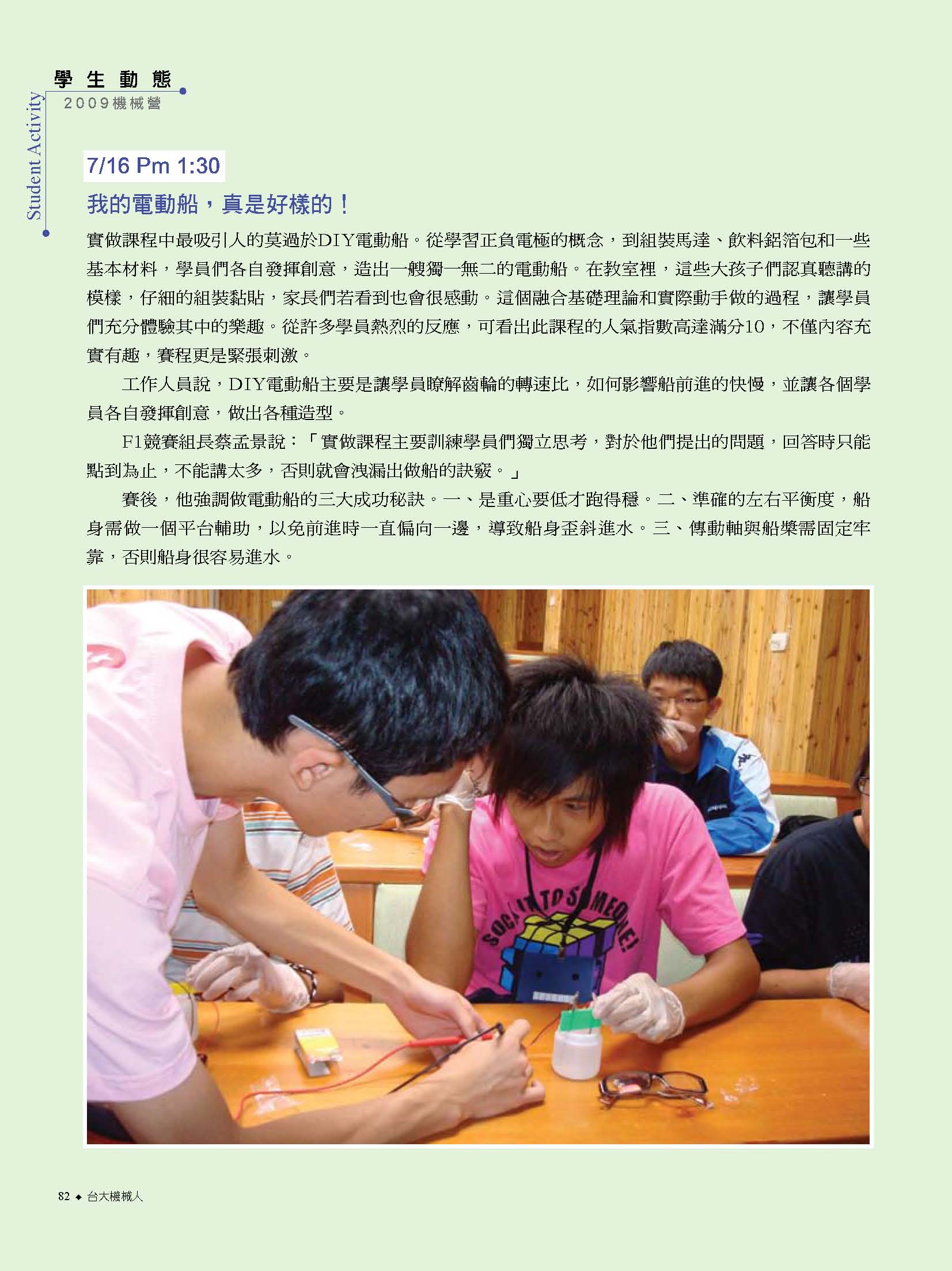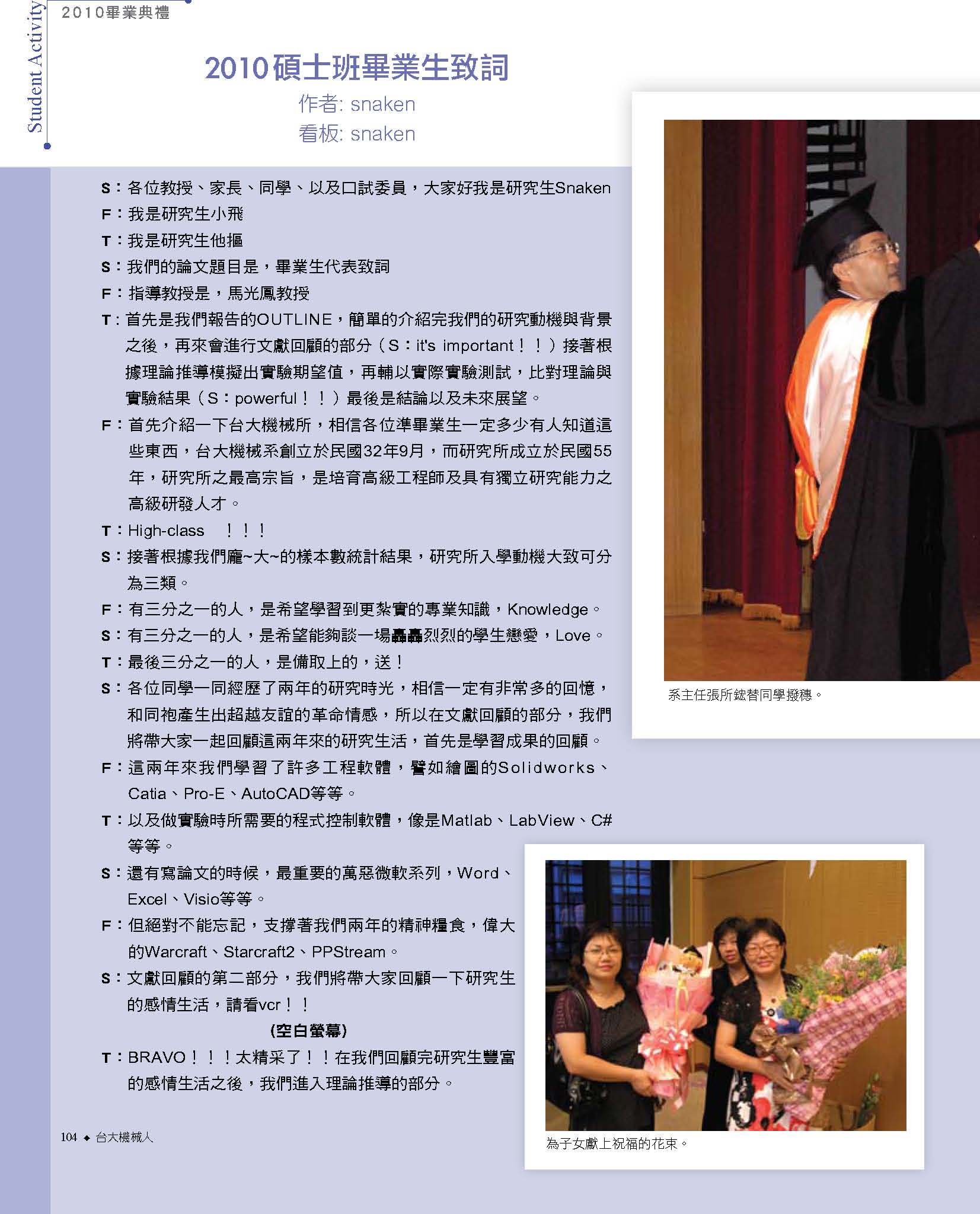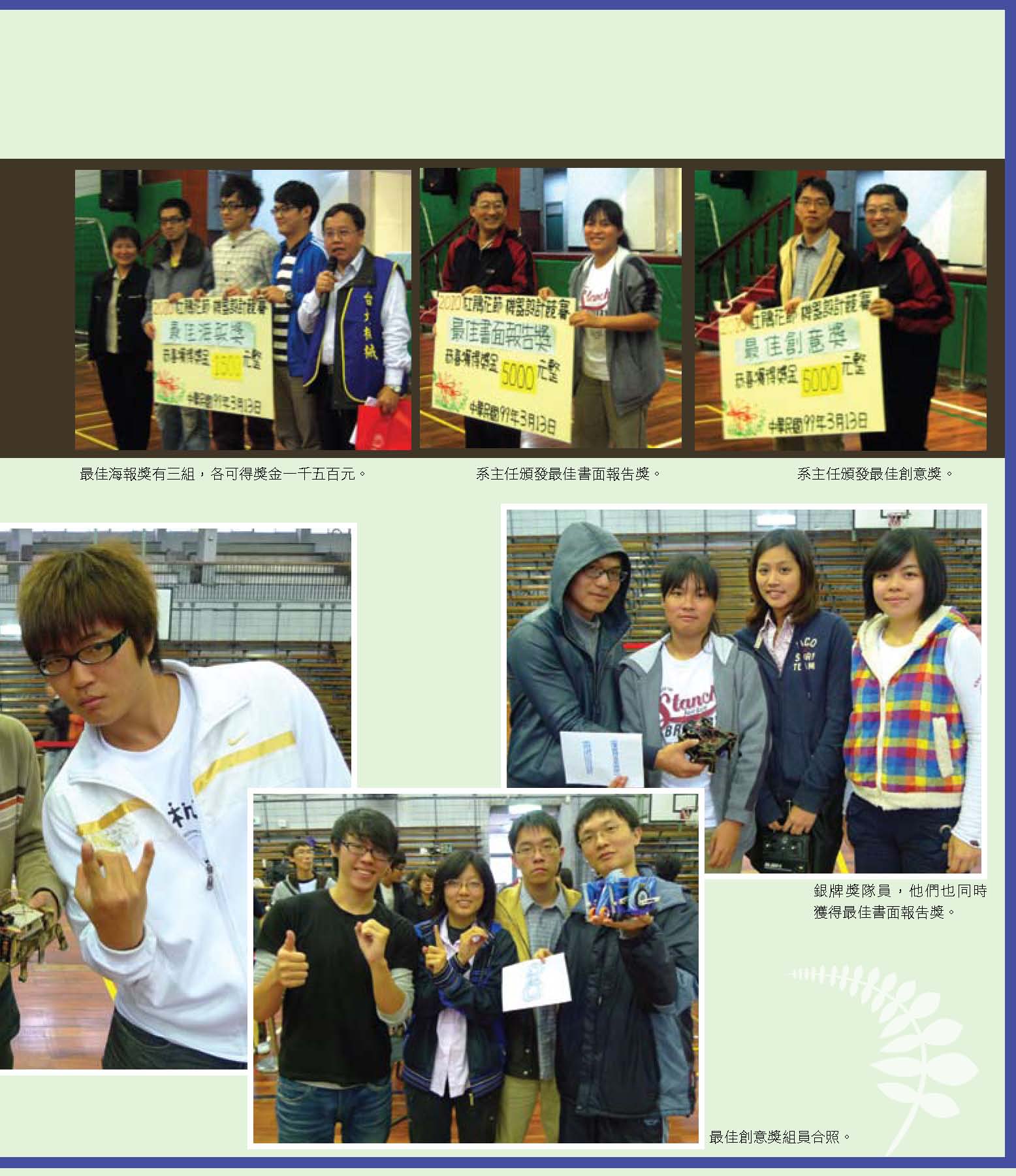 而振芬跟鈺雲也分別採訪了精彩的機械之夜、機械競賽、機械營跟尾牙大會師等活動,更讓人見識到台大機械系學生的絕倫創意;同學們不僅能歌善舞、也能把書本的理論應用到機械設計之中,想知道更多精彩實況嗎?快翻開這期的系刊吧!