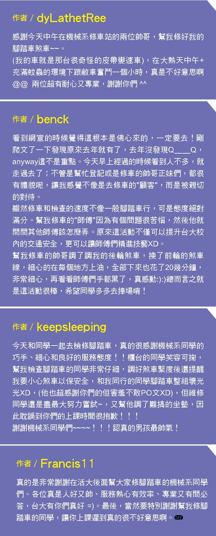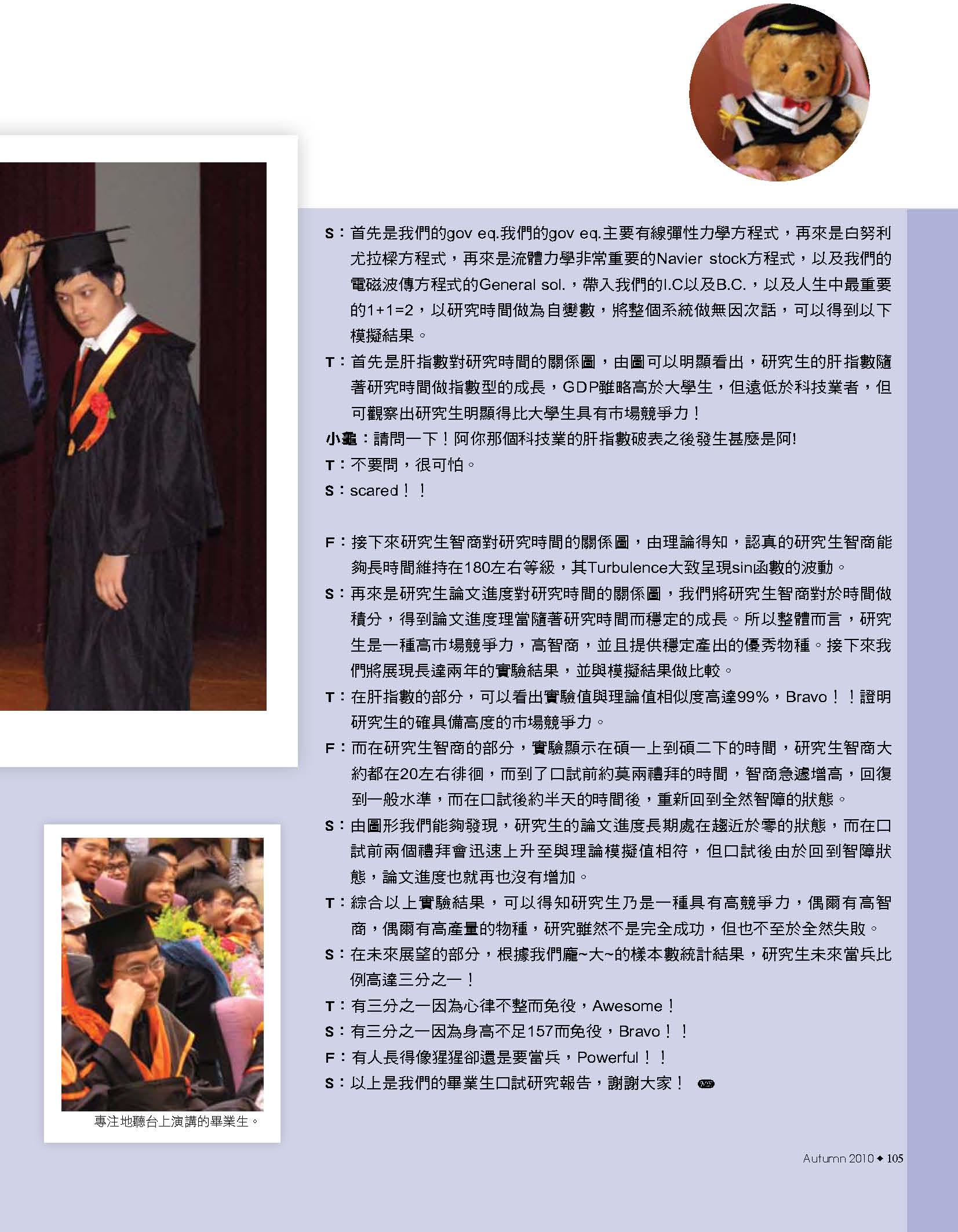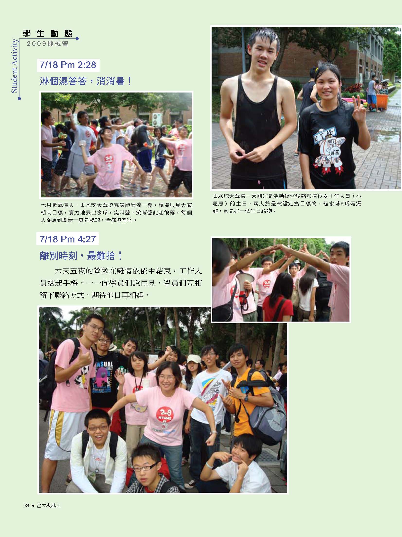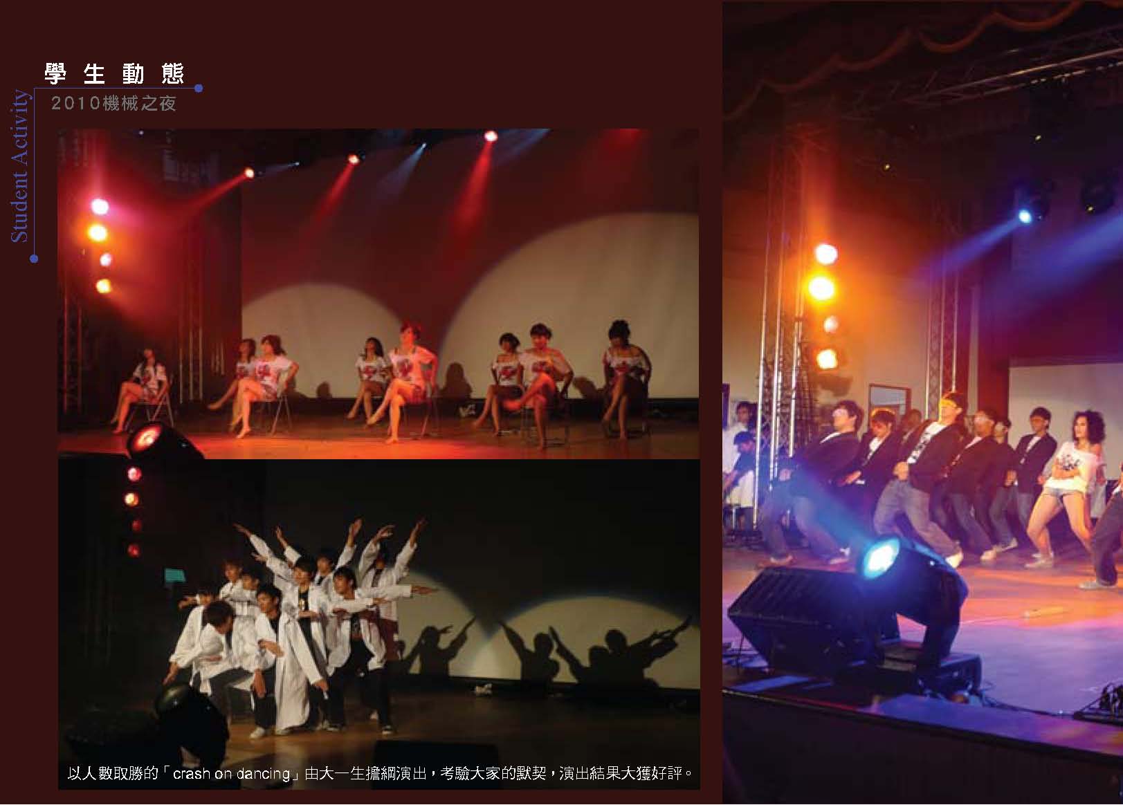 而振芬跟鈺雲也分別採訪了精彩的機械之夜、機械競賽、機械營跟尾牙大會師等活動,更讓人見識到台大機械系學生的絕倫創意;同學們不僅能歌善舞、也能把書本的理論應用到機械設計之中,想知道更多精彩實況嗎?快翻開這期的系刊吧!