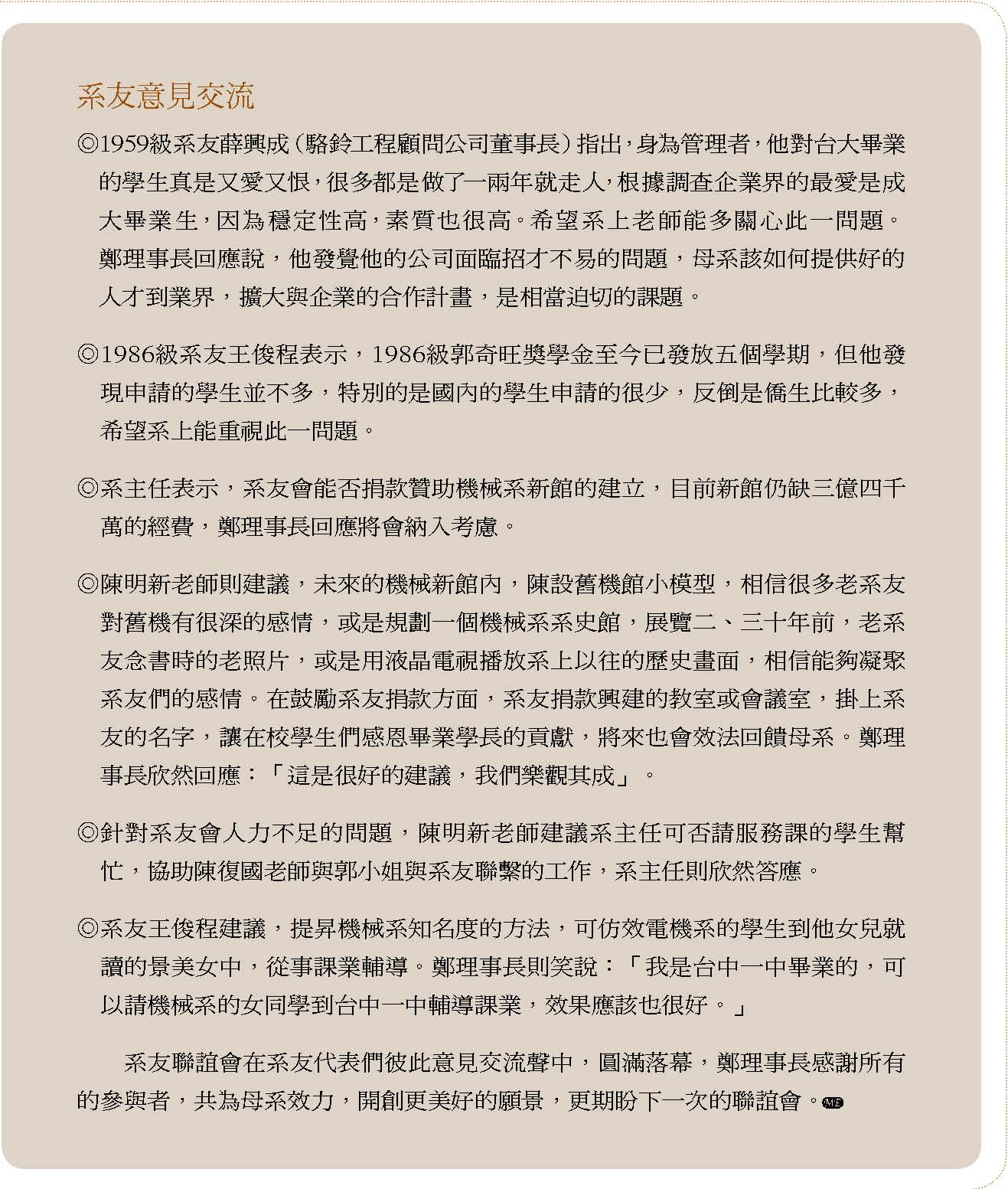 熱心的系友呂廣英先生也特別撰文分享「如果我再是個機械系學生」一文,詳細說明求學階段應該培養的能力,以及成為專業經理人應有的態度,希望幫助同學們提前做好準備,以利出社會求職。