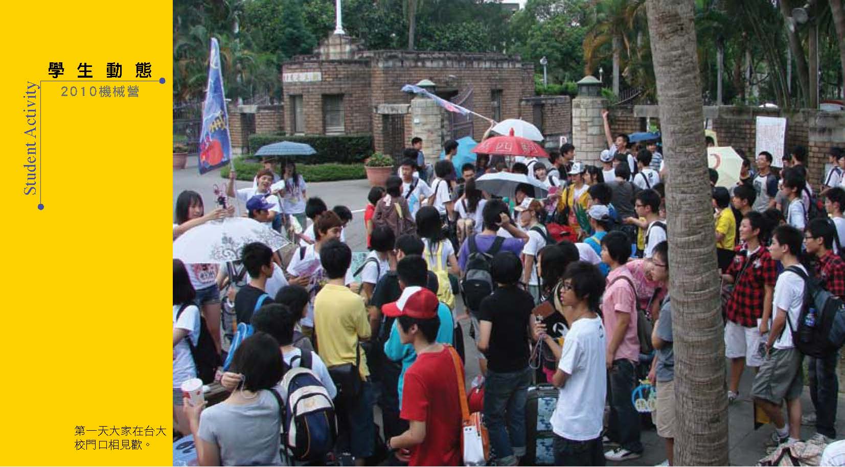 拎著簡單的行李,今天要來參加台大機械營囉!今年的服裝是亮眼的土耳其藍,映襯出年輕的光采。一年一度的機械營在大哥大姐的精心規畫下,為高中生們打開一扇瞭解認識機械的大門,透過有趣的活動與課程規劃,大家也從原本的陌生,變成志同道合的好朋友囉。2010台大機械營,成功!