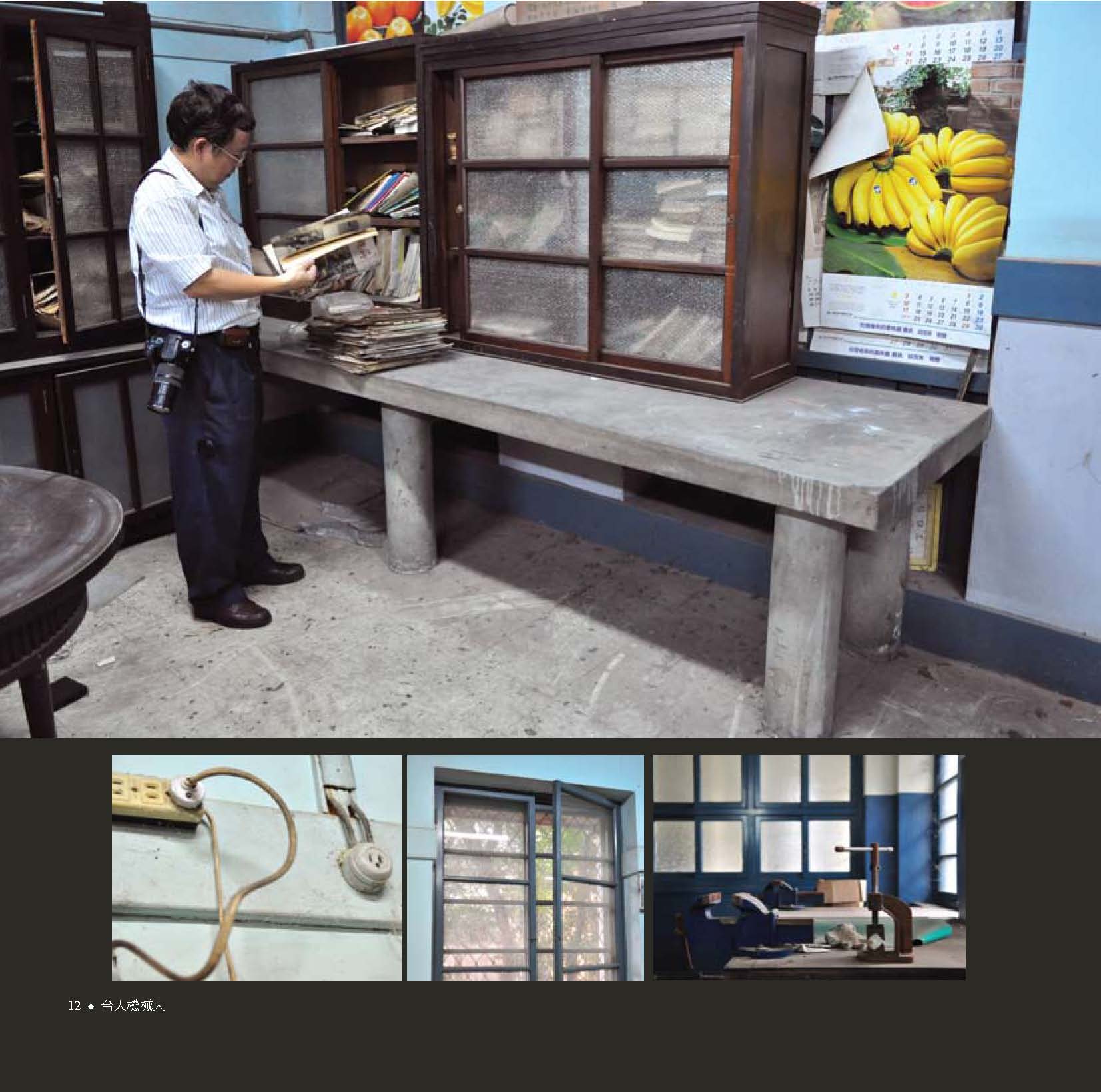 因應機械系舊館的拆除與新館的擘建,我們特別企劃了「典藏系館風華」單元,以不同的角度拍攝舊機,希望能為機械系留下最精彩的系館倩影;在鐘添東老師、周賢福老師與蘇培珍老師的陪同解說下,攝影努力捕捉即將塵封的迴廊梯間、屏風、石桌、管線…的風采,希望這些珍貴的照片能為大家珍藏美好的回憶。