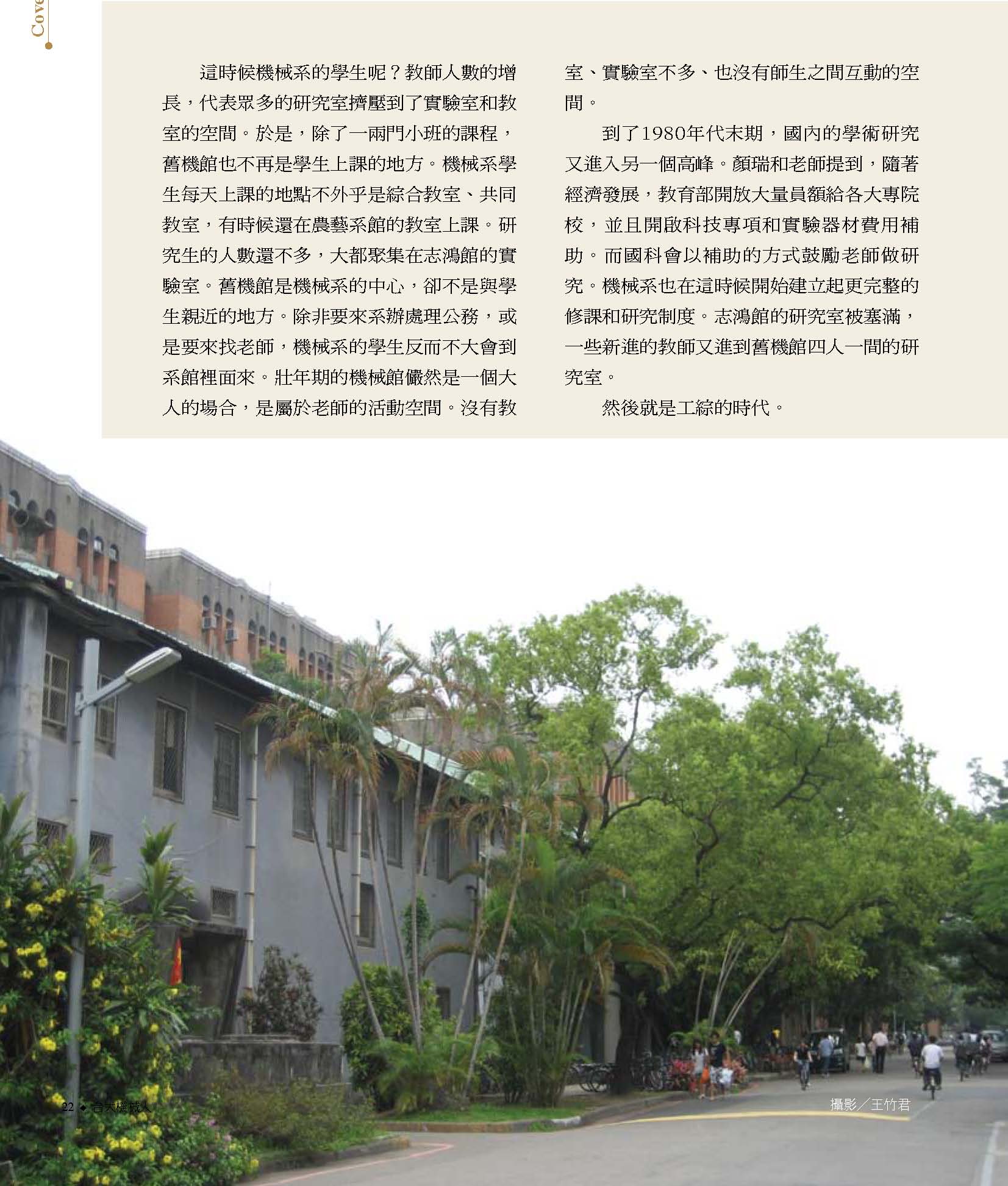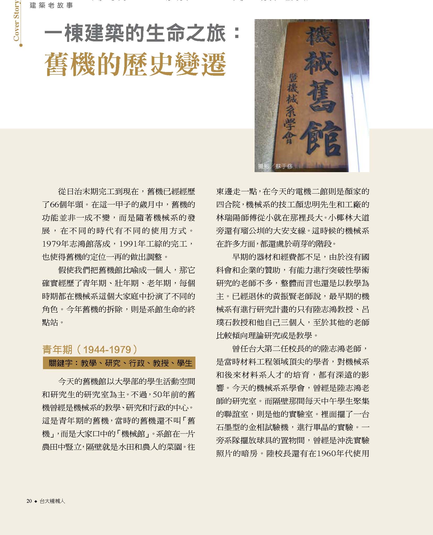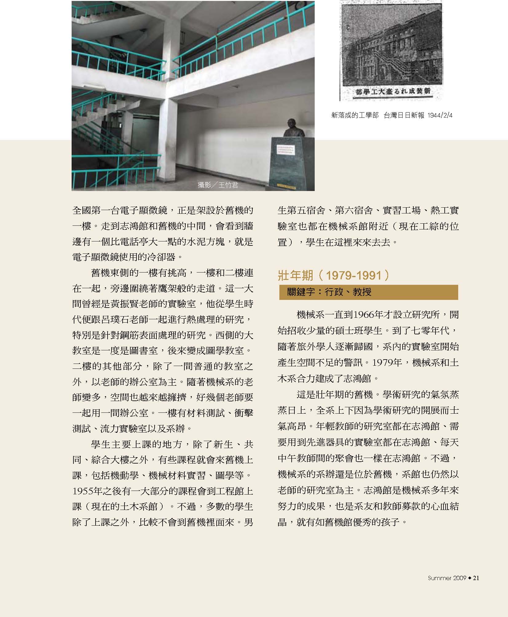 8典藏系館風華 14從舊機一窺南進基地的藍圖 16機械舊館的建築特色 20機械舊館的歷史變遷 24舊機的一天 26募來的系館 志鴻館 30志鴻館三十年的點滴