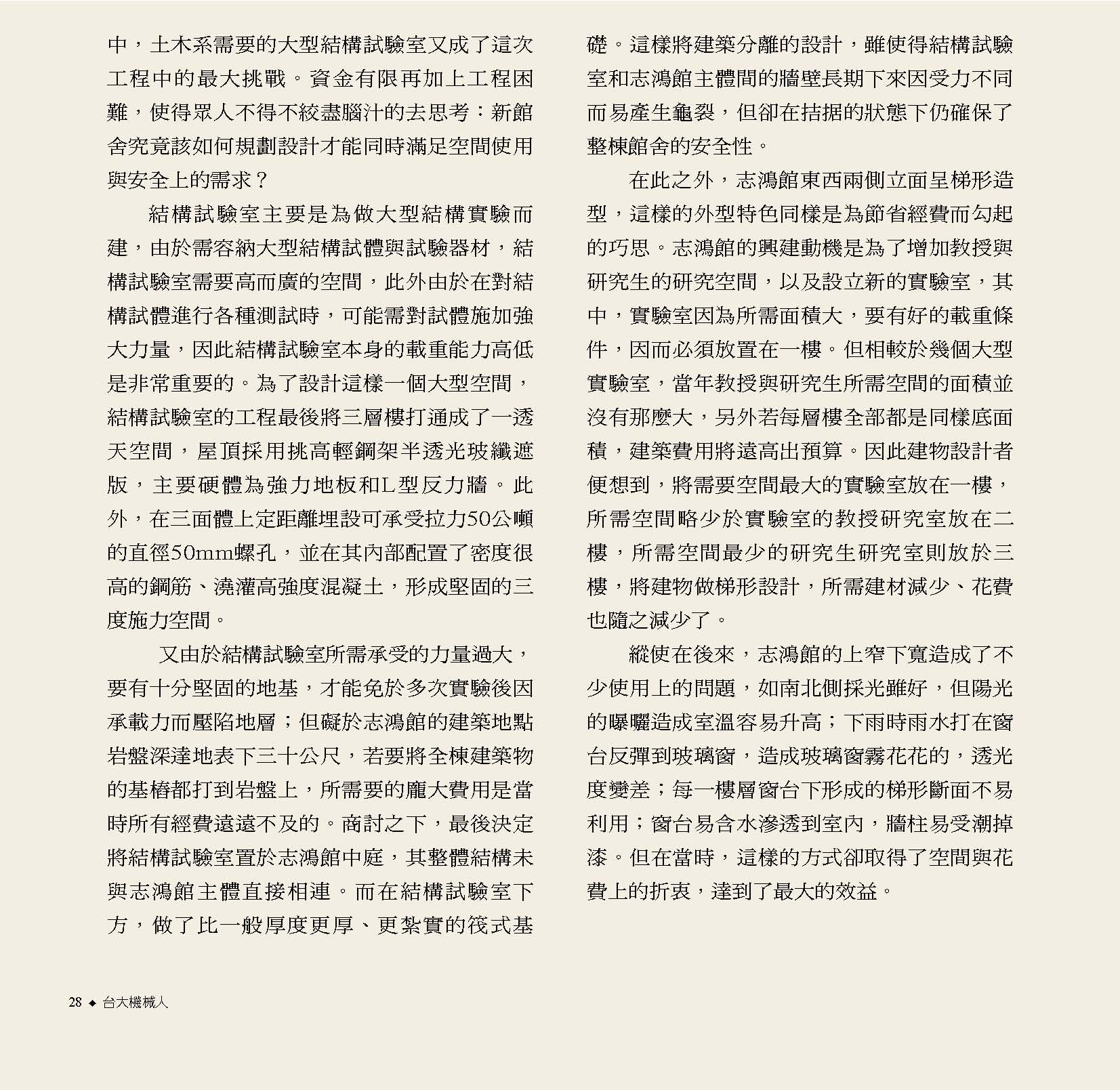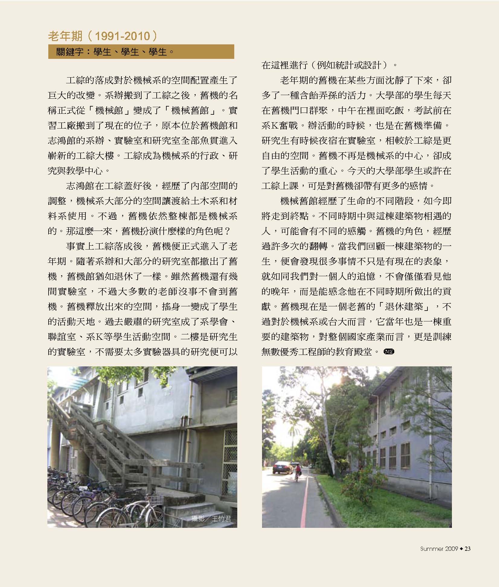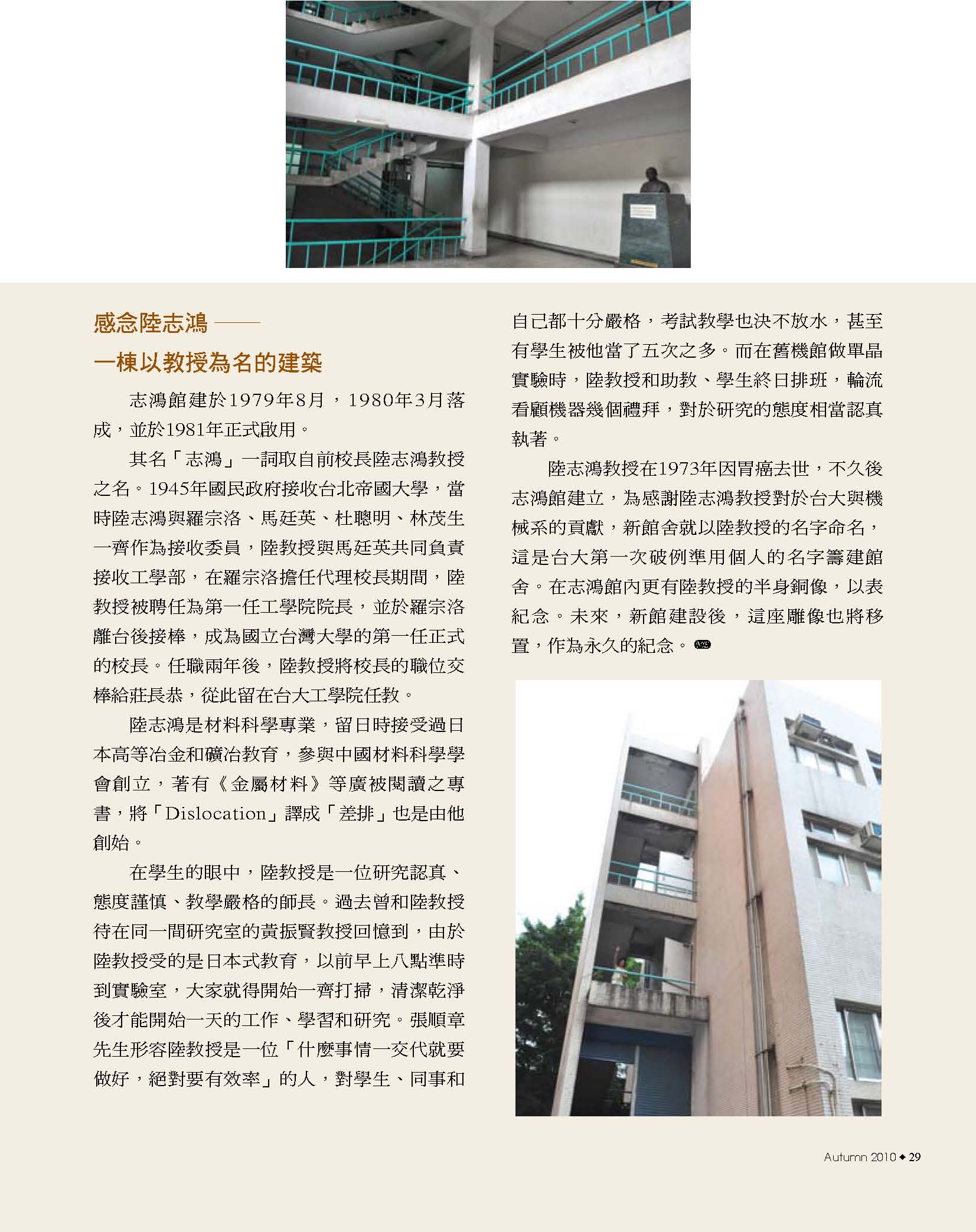 8典藏系館風華 14從舊機一窺南進基地的藍圖 16機械舊館的建築特色 20機械舊館的歷史變遷 24舊機的一天 26募來的系館 志鴻館 30志鴻館三十年的點滴